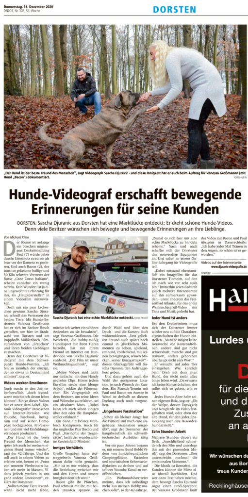 "Ein Fenster in die Vergangenheit" - so nennt Sascha Djuranic seine Werke, wenn sie fertig sind. Denn der gebürtige Weselaner ist Hundevideograf und hält als solcher die Beziehung zwischen Hund und Herrchen oder Frauchen für die Ewigkeit fest.